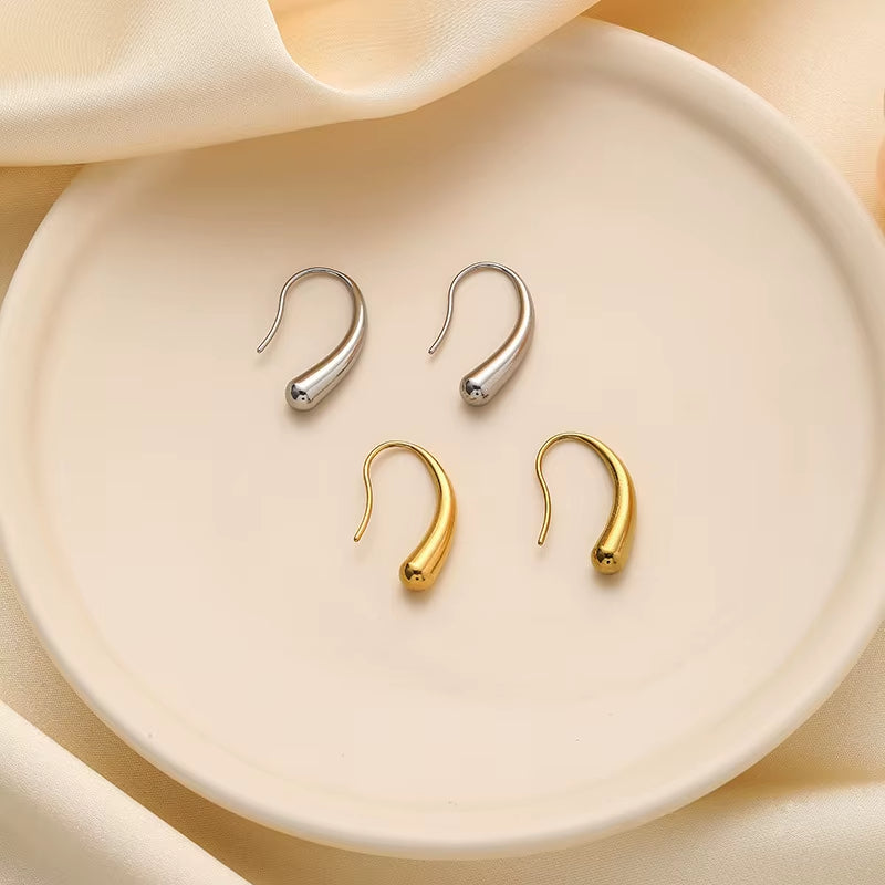 Dessa eleganta örhängen ger samma rena glans som en morgondagg på bladspetsen. Den smäckra, svepande siluetten framhäver käklinjen och är lika elegant till stickad polotröja som till aftonklänning. Välj mellan spegelblankt 18K guldpläterat eller sofistikerat polerat stål – båda i hypoallergen 316L-kvalitet som håller färgen år efter år.